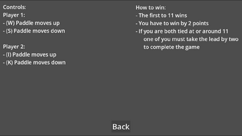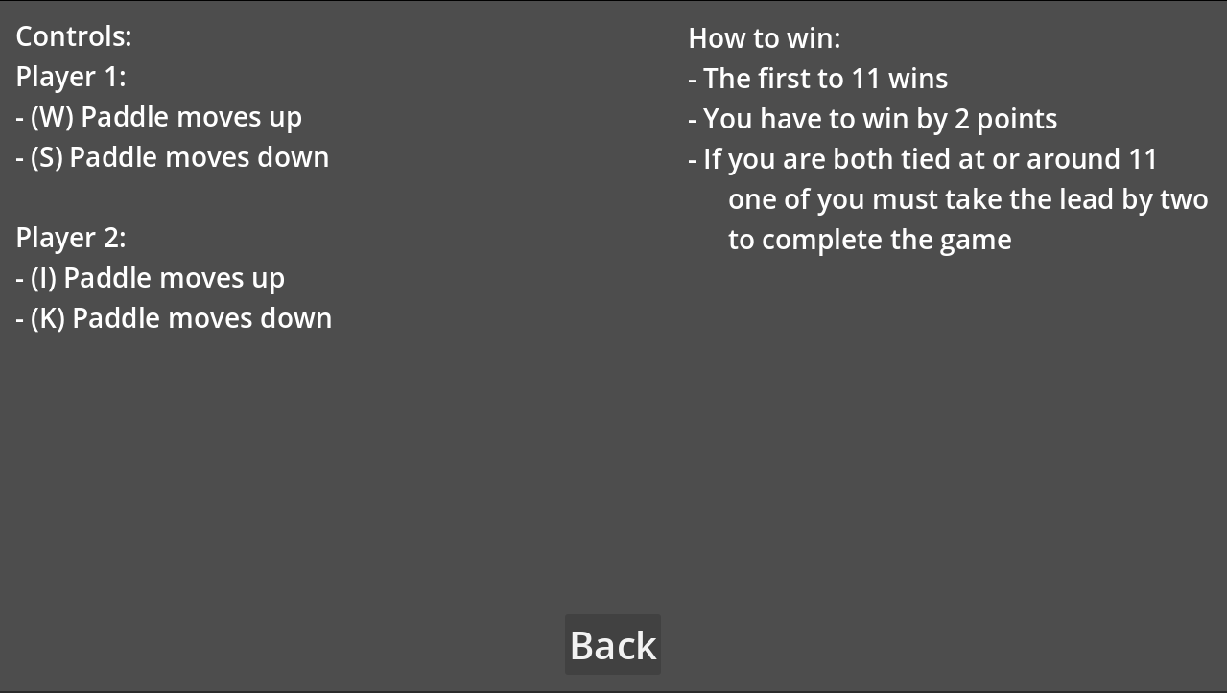Player 1 uses W & S to move their paddle, and Player 2 uses I & K to move theirs. First to 11 points wins, but you need to win by 2!